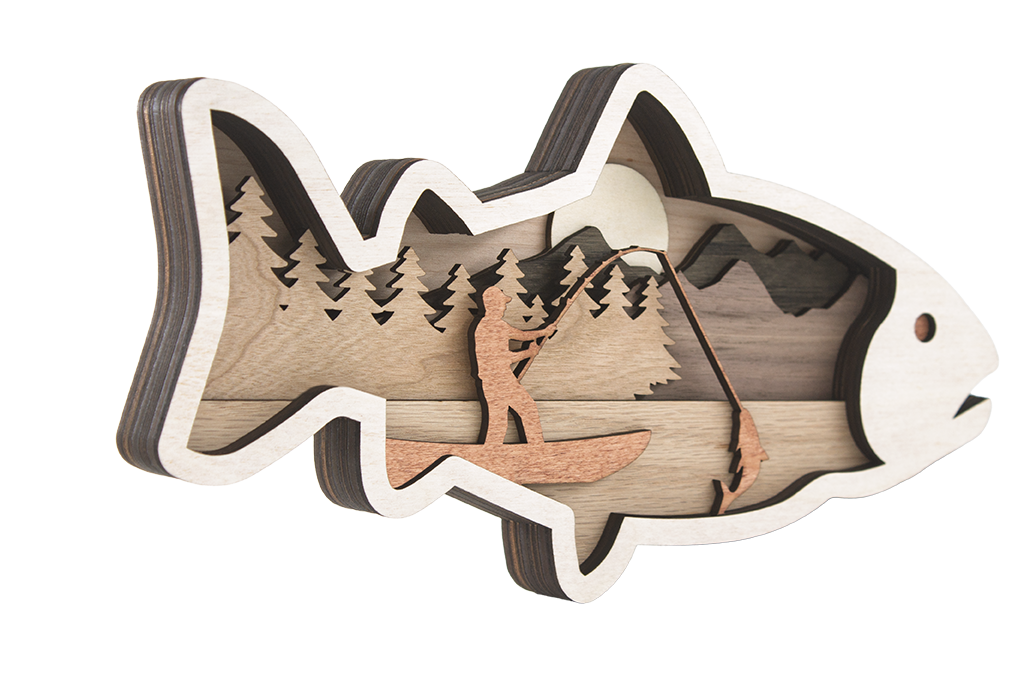 This impressive 3D shadowbox combines precision laser cutting with traditional craftsmanship to create a captivating fishing scene. Measuring 11" × 5.8" × 1" thick, each piece is meticulously constructed from 8 individual layers of 1/8" wood, with select layers professionally stained to create depth and visual contrast.